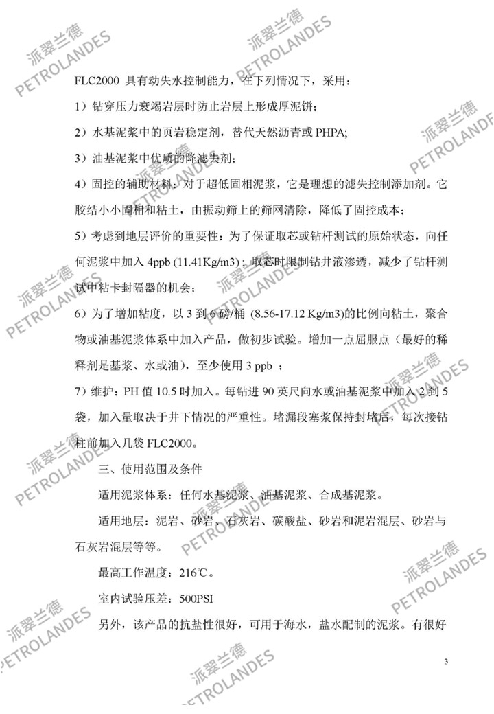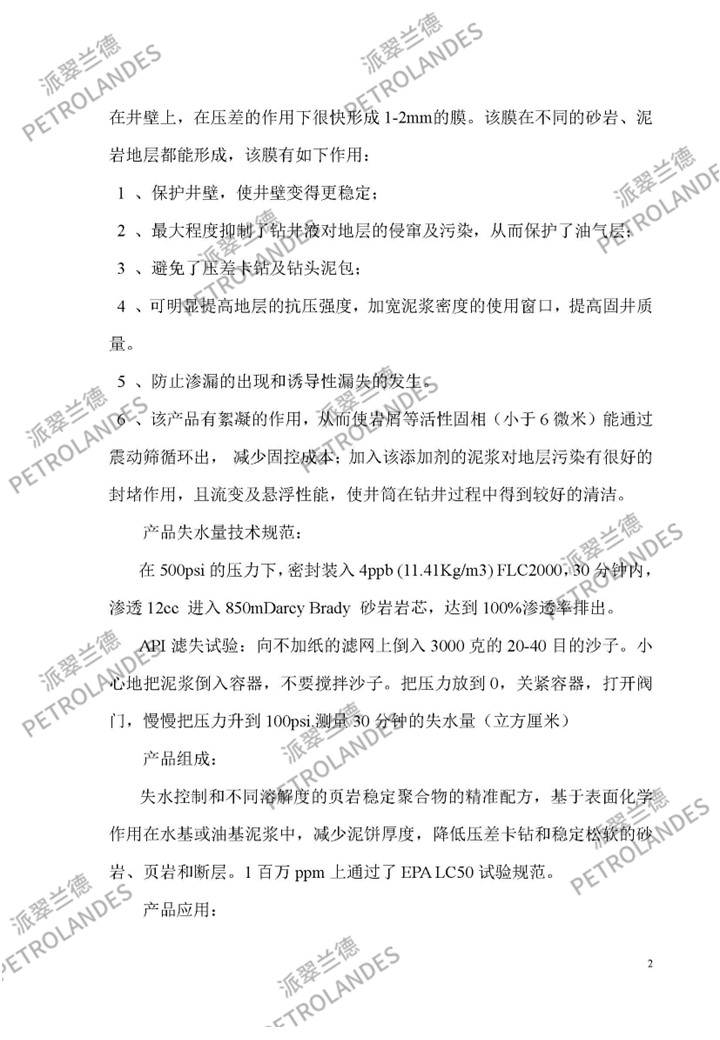 FLC-2000是一种抗高温的动失水控制剂和井眼稳定剂。它不受井内的污染物影响,用于水或油基泥浆。本产品可以转换任何的水基或油基钻井液或修井液(包括甲酸钠)成为无渗透钻井液。